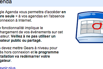 Cette fonction utilise Google Gears qui stockera les informations en mémoire cache sur votre navigateur. Bien qu’intéressant, le mode hors connexion a plusieurs limitations. Actuellement, il est impossible de créer de nouveaux événements lorsque vous n’êtes pas branché et vous devez activer le mode hors connexion manuellement.