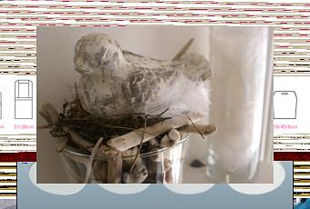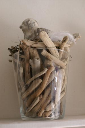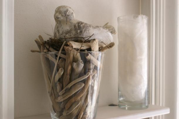 Un grand pot en verre transparent, une volée de petit bois flotté ramassé au fil des promenades sur la plage, un nid tombé du jardin, une petite plume...