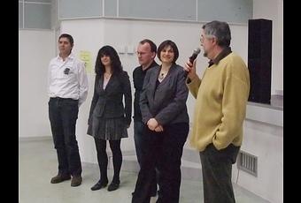 Pendant l'échange avec le public, de gauche à droite: Pierrot et Viviane DUBOURG, Sylvain et Diana BUCHMULLER. (Photo: François BASSAGET pour le journal "Le Dauphiné Libéré")