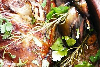 Enfournez et laissez cuire 1/2 heure. Mouillez ensuite avec le bouillon de volaille et le vin blanc. Baissez la température à 140 deg. Retournez la viande et arrosez du jus régulièrement. 1/2 heure avant la fin de cuisson , ajoutez les artichauts lavés et coupez en deux. La viande et cuite et tendre quand vous pouvez enfoncez la viande avec une cuillère.Effeuillez de la coriandre avant de servir