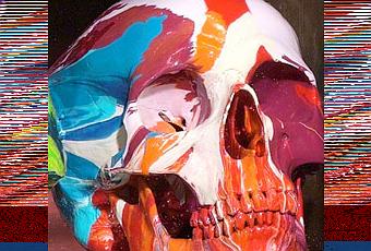 design-oriented. Le site du musée indique qu'il y explore la frontière entre le sacré et le profane, extrapolant probablement le fait de peindre avec une telle violence des objets si puissants et intouchables que des crânes, des restes humains. Ce que j'ai pour ma part tout de suite pensé, c'est que la sensation de fraîcheur, de récent émanant des aplats de gouache criards presque conflictuels figure le caractère éternel de la pensée humaine, qui elle-même souvent émane de psychés complexes et en questionnement permanent ; les têtes sont d'ailleurs déposées sur des armoires murales de collection. La force d'évocation de la mort entre évidemment en jeu dans l'impact de la pièce mais se trouve largement atténuée par l'uniformité des sculptures une fois