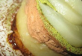 Qui ne connaît pas Fabrice, le vainqueur "d'Un dîner presque parfait" qui a un blog superbe!!Très tentante sa recette ......alors, je me suis lancée et voilà ce que cela donne!Un fond de pain d'épice imbibé de sirop de poires, recouvert d'une mousse légère aux poires , d'une mousse au chocolat parfumée subtilement à la cannelle et le tout saupoudré d'un fin voile de thé Matcha! Pour votre marché:-25 cl de crème-180 gr de chocolat (ici au lait)-1 càc de cannelle moulue-4 poires (ici en bocaux et égouttées, donc 8 demi-poires)-125 gr de sucre 4 tranches de pain d'épice Je mets mon tablier:*Dans une casserole,porter la crème liquide à ébullition.*Ajouter le chocolat en morceaux, laisser fondre.*Ajouter la cannelle et laisser refroidir.*Mettre au frigo pendant 2 heures.*Au bout de 2 heures, fouetter la crème à l'aide d'un batteur électrique, elle monte très vite.*Eplucher les poires si elles sont natures, et les pocher dans 125gr de sucre et 50cl d'eau pendant 20 minutes.*Egoutter et récupérer le sirop.*Mixer toutes les poires et en garder pour la décoration.*Tailler les tranches de pain d'épices avec les cercles,et les placer au fond de ces emporte-pièces.*Les imbiber de sirop de poires*Etaler une couche de compote de poires.*Couvrir d'une couche de chocolat jusqu'au bord et lisser.*Mettre au frigo pendant 2 heures.*Saupoudrer avec le thé Matcha*Décorer de lamelles de poires. Un délice, et Fabrice, si tu passes par ici, MERCI !!Bon week-e,d à tout le monde!