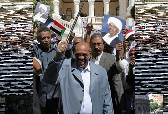 (Le président soudanais Omar el-Béchir brandissant sa canne devant ses portraits lors d’une “manif” organisée par son gouvernement obscurantiste)