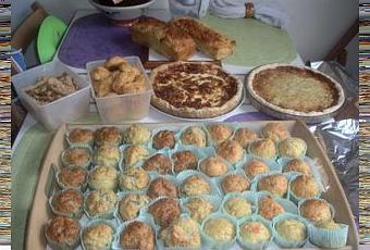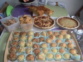 Et comme une photo vaut tous les mots, voilà donc ce que j'avais préparé pour samedi soir: 46 muffins, deux cakes, deux tartes, des gougères au fromage et des crackers.
