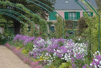 Devant la maison et les ateliers, le clos normand, au tracé rectiligne, aux voûtes de plantes aériennes entourant d’éblouissants massifs, propose du printemps à l’automne la palette changeante d’un peintre jardinier "fou de fleurs".
