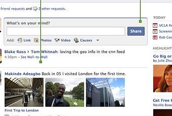 Sur la copie d’écran ci-dessous (source) vous pouvez voir tout d’abord que les onglets ont disparus, on pourra toujours afficher les contenus par type (Photos, Videos, Liens) mais ca sera désormais possible via la colonne de gauche. Annoncé également, le rafraichissement automatique de la page d’accueil, comme c’est déjà le cas actuellement sous l’onglet “Live Feed”. Enfin dernier changement de taille, le module de partage sera présent également dès la page d’accueil, alors qu’il se trouve actuellement sur la page profil de l’utilisateur… Ce dernier changement traduit bien l’envie de Facebook de devenir une plateforme de génération/agrégation de contenus avec pour premier “contenu” les statuts des utilisateurs. Ces mêmes statuts d’utilisateurs qui sont le “coeur de marché” de Twitter.
