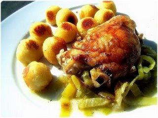Couper le poireau en rondelles et l'ajouter au plat contenant le poulet. Réserver.