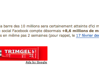 Peut être ai-je manqué quelque chose… Les personnes souhaitant maigrir sont-elles de ferventes lectrices de Mashable ? Je ne me trompe certainement pas en affirmant que la cible de ce produit (Trimgel) est particulièrement féminine… Or le lectorat de Mashable est selon moi peu intéressé par les produits amincissant…