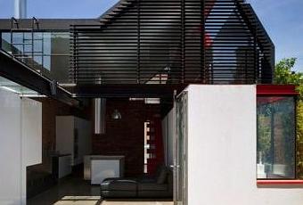 ''The australian architects Andrew Maynard, of which I have already mentioned here carried out a loft extension order, the direct reference to Dark Vader, in my humble opinion. This extension is indeed a skeleton of steel black striped literally leaving its surrounding wall, and creating a break with the symmetry characteristic of the roof area of Victorian style. This creates a wide corridor with mezzanine and a courtyard design. The use of glass allows an inside / outside very interesting.''