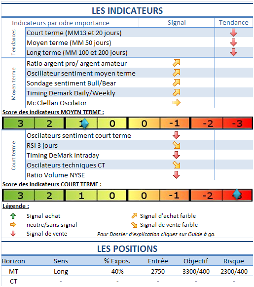 Désormais nos indicateurs sont en extrême surachat. Toute hausse persistante au dessus de 2750 ne devrait pas être soutenable dans les quelques jours qui viennent. Les indicateurs de sentiment sont en extrême surachat/suroptimisme, les temporalités 30/60 minutes montrent des signaux de timing de changement directionnels et le ratio volume est au plus haut 02 Janvier 2009.