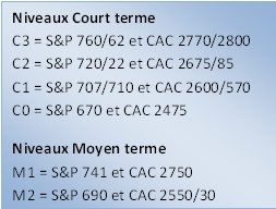 Forte hausse des marchés asiatiques cette nuit. Le Nikkei prenait plus de 5%. Le pétrole baisse, l'euro monte et les indices européens sont à nouveau en hausse considérable. Notre scénario privilégié était « Les acheteurs sont forts et utilise les zones supports C1 comme zone d'entrée. Auquel cas nous devrions avoir une réaction haussière vers ces niveaux, ce qui devrait permettre d'aller côtoyer les résistances M1. » Nous avons donc put acheter sur réaction sur le support 2600 pour viser 2750/75 atteint ce matin. Dans le flash posté plus tôt nous recommandons donc de prendre les bénéfices.