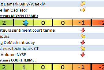 A court terme nos oscillateurs technique ne donnent pas un signal complet mais nous en somme très proche et le RSI 3 jours n'est pas au dessus de 90 (il est à 85 actuellement). Si ces deux indicateurs rejoignaient la liste, les probabilités de voir une correction sous 5 jours approcherait les 100%.