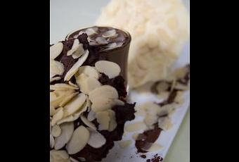 Vous pouvez jouer sur l’alternance des couleurs du chocolat sur l’assiette et orner les bords de l’assiette avec du chocolat en poudre et des amandes.