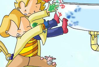 La pizza va refroidir et les parents risquent de se chauffer , c'est pourquoi Cha et Capi ne manquent pas d'imagination pour atteindre ce fameux robinet : mais même avec toute leur bonne volonté et malgré les périlleuses acrobaties , l'eau ne coule toujours pas sur les petites mains colorées .