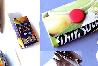 Comment des packs de lait, de jus de fruit ou de soupe peuvent devenir des portemonnaies? Grâce au site EspritCabane.com, vous allez découvrir que vous pouvez faire vous-même, et très facilement, un porte-monnaie de récup plutôt original en recyclant vos packs en carton. Vous pouvez également aller jeter un oeil sur le site Berlingot.ch (berlingot étant le nom suisse pour les packs): différents modèles y sont vendus au prix de 15CHF (soit environ 9.75 euros). A découvrir également sur ce site une petite animation sur la fabrication. Source