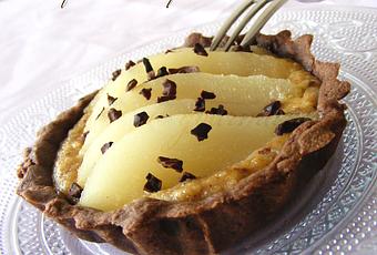 Une pâte sablée au cacao, une crème à la noisette et au café (sans beurre ni oeufs), le tout rehaussé de lamelles de poires et de grué de cacao pour le croquant, voilà l'association parfaite d'un excellent dessert à servir en fin de repas.