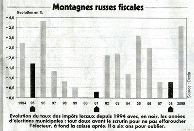 La lecture régulière du Canard enchaîné est un pur bonheur. Ceux qui ne peuvent l'acheter le trouveront à la Médiathèque de Louviers où il est consultable gratuitement. Cette semaine, le Canard nous apprend que les impôts locaux, selon les prévisions du ministère de l'Intérieur, vont augmenter pour deux raisons : primo parce que les bases locatives vont croître du taux décidé par le Parlement, secundo parce que les maires vont profiter de la crise et de l'année post-électorale pour matraquer le contribuable.A Louviers, nous sommes exactement dans ce cas de figure. Avant et pendant la campagne électorale, le maire a juré ses grands Dieux que les taux des taxes n'augmenteraient pas. Il l'a même répété au cours d'une séance de conseil municipal assez récente mais il a aussitôt oublié qu'il avait dit ce qu'il avait dit. Et comme par hasard, l'année 2009 (qui succède à 2008, cela ne vous aura pas échappé) la municipalité va augmenter les taux des taxes sous les prétextes maintenant bien connus et largement expliqués dans le dernier bulletin municipal transformé, pour l'occasion, en outil d'auto-justification…avant l'autopunition.
