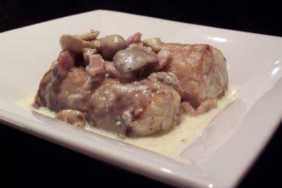 Ajouter la crème et les champignons et laisser réduire 5 min.