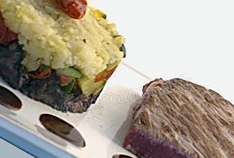 Sur le côté d'une assiette, dans un cercle en inox dresser un peu de viande. Recouvrir avec des dés de légumes et terminer par les pommes de terre, tasser avec le dos d'une cuillère. Enlever le cercle délicatement en le tirant vers le haut, poser la viande juste saisie à côté et mettre quelques gouttes de sauce réduite.