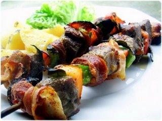 Enfiler les dés de viande sur les piques en alternance avec les demi-tranches de lard pliées en deux, les dés de poivrons, des feuilles de laurier entières, du chouriço, etc.