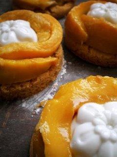 Déposer une panna cotta au centre de chacun des sablés puis entourer de lamelles de mangue en rosace.