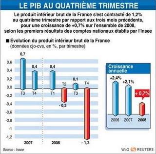 Aujourd'hui, c'est l'INSEE qui confirme la situation et vient apporter des précisions au sujet de la crise et de ses répercussions. l'institut prévoit pour 2009 une année de récession historique (la dernière récession française avait eu lieu en 1993) avec un recul de l'activité de 1,5 % au premier trimestre et un taux de chômage qui augmentera (387 000 de postes en moins pour les six premiers mois de 2009).