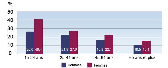 Ainsi, les femmes (26 %) sont plus nombreuses que les hommes (19,5 %) à souffrir de détresse psychologique élevée, quel que soit leur groupe d’âge.