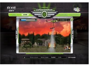Lorsque l'advertainment prend la forme d'un jeu vidéo on parle aussi d'"advergame". Ce jeu est issu de la campagne de communication pour le déodorant Axe Dry. Il reprend l'idée du spot tv où un homme est utilisé comme canadair (spot non diffusé à la tv française). Pour ma part j'ai réussi à faire 7622 points. A vous de jouer.http://www.canadairman.com