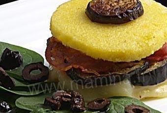 MILLEFEUILLE DE POLENTA ET D'AUBERGINES AU PROVOLONE ET AU CHORIZO