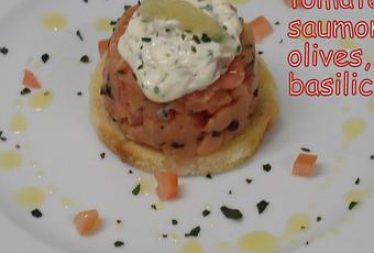 Bonjour, aujourd'hui, une entrée simple, fraîche et savoureuse.Pour 4 tartares : 250gr de chair de saumon frais laver et couper en petits morceaux, 2 tomates moyenne laver éplucher vider et couper en petits cubes(conserver une CàS pour la déco), 3 feuilles de basilic hacher(conserver une pincée pour la déco), 5gr de gingembre frais couper en petits cube et confit avec 10gr de sucre en poudre(a sec sur feu vif sans caraméliser), sel et poivre, un peu d'huile d'olive. Mélanger tous ces ingrédients et dresser sur assiette comme un petit steak tartare, à l'aide d'un emporte pièce ou d'une petite boite de conserve ouverte des deux cotés. Décorer avec quelque petits cube de tomate, un peu de basilic haché et un trait d'huile d'olive. J'ai rajouter un peu de sauce tartare (mayonnaise câpres persil échalotes haché) et un toast de pain de mie grillé pour le support. Bonne appétit.