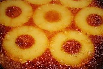 Laisser tiédir un peu avant de démouler et arroser le gâteau tiède avec le jus de la boîte réduit et parfumé avec le reste de rhum.
