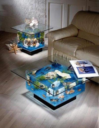 Coffee Table Aquarium : pas forcément de très bon goût que cette table basse aquarium … sans poisson, des galets, une lumière colorée, et hop cela pourrait certainement prendre tout son sens.