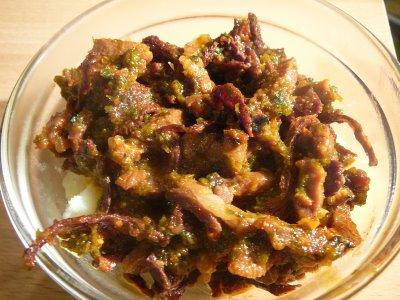 Quand l’agneau change de couleur, ajouter les champignons et l’eau de trempage avec les autres ingrédients.