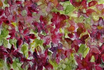 Les ficoïdes fleurissent ici dès le début du printemps. Elles s’épanouissent au soleil dès le matin, avec leurs fleurs de couleur orange, rouge, rose fushia ou encore violette ou mauve. Dès la fin de la journée par contre elles se referment. Ce sont des plantes grasses qui supportent le temps très sec. Elles sont très couvrantes. Elles ressemblent un peu à des marguerites, mais avec des tiges grasses. Dans le jardin, dans une rocaille, elles sont orange. Par contre, au pied de l’ albizzia, ce sont des ficoïdes violets (lampranthus calcartatus). J’ai voulu les saisir sur l’instant. Je n’ai bien entendu pas essayer de faire une aquarelle botaniste. Ce n’est ni dans mon style et je n’en aurais pas la patience. Sinon je me contente de prendre une photo.Voici donc cette aquarelle