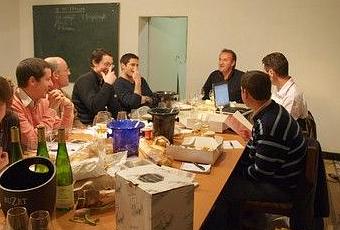 Sylvaner 2007 : robe d'un or intense, quelques larmes. Nez sur le raisin confit, le miel, et une pointe de cidre qui ne fera que prendre de l'ampleur à l'aération. Bouche ronde, mûre, avec une acidité ascendante, et une volatile qui commence à s'installer. Finale assez puissante, mêlant les notes salines à la pomme en fermentation. Premier vin, première division du groupe. Ca plait plutôt à certains. Je n'aime pas franchement. Je lui mets la plus mauvaise note depuis que je participe aux soirées du club :