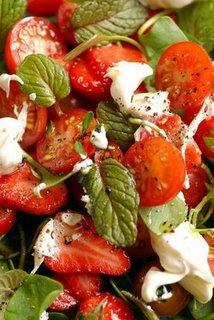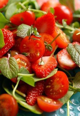 Faites un petit lit de pourpier dans une assiette et répartissez le reste des ingrédients, les tomates, les fraises et les feuilles de menthe, mélangez très rapidement.