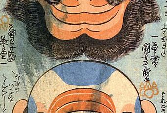 L’estampe ci-dessus, de Kuniyoshi (environ 1852), représente Hotei (le Buddha rieur) et Shoki (un personnage de légende). Vue à l’envers (voir ci-dessous), Hotei devient Asahina (un personnage de roman) et Shoki devient Zhan Fei (général militaire chinois).