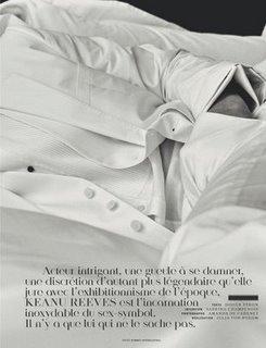 Keanu Reeves est à l'honneur pour le magazine Vogue Hommes International du mois d'avril prochain. Plutôt discret sur sa vie privée, il se fait rare sur le devant de la scène. Son dernier film date de décembre dernier, 'The day the earth stood still', selon Imdb, deux autres sont sur le point de sortir ou en préparation 'The private lives of Pippa Lee' et 'Stompanato'. Assez de papotage, je vous laisse en compagnie du charmant Keanu ;) Source