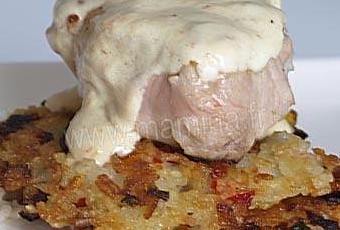 Dans chaque assiette, chaude si possible, poser 2 ou 3 galettes l'une sur l'autre avant d'ajouter un tournedos et de l'arroser avec un peu de sauce crémeuse.