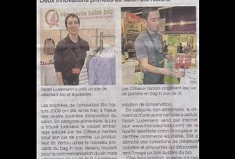 “En catégorie non alimentaire, la démarche d’une jeune nantaise a séduit. Sarah Ludemann vend par internet (sur www.monsieurrose.com) de la layette labellisée coton biologique et certifiée commerce équitable. Elle a déniché des collections de créateurs colorées et amusntes qui dépoussièrent l’image un brin austère du bio. ”