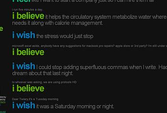 Twistori extrait le contenu de twitter avec les filtres suivants : love / hate / think / believe / feel / wish.