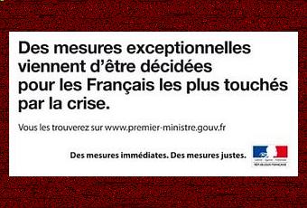 Une récente campagne de publicité orchestrée par les services du Premier ministre laisse à penser que le gouvernement est en train d’infléchir sa politique de relance. En effet, alors que la relance était jusqu'à maintenant centrée sur l’investissement et la sauvegarde des emplois, des mesures sociales sont, depuis le 19 mars, mises en place. Appelées mesures sociales exceptionnelles, elles concernent :- 6 millions de foyers modestes qui paieront moins d’impôts sur le revenu en 2009 ;