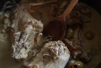 Un lapin et une cocotte, les prémices d'une belle histoire d'amour. Quelques amis qui viennent dîner et voilà l'excuse pour leur monter une baraque. Pas de plan à l'horizon. Rien d'écrit. Juste le frigo qui me dit "mate un peu ici". Le lapin n'en pose pas un (de lapin) à la cocotte et vient même accompagné de quelques olives vertes et d'oignons nouveaux histoire de se mettre sur son trente et un. La cocotte n'en revient pas. Elle est sous le charme et nous aussi.