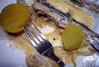 Maquereaux à la crème et au cidre 2 maquereaux 20cl de crème fraîche 25cl de cidre 1 oeuf 1 oignon sel et poivreEplucher l'oignon et le couper en fines rondelles. Préchauffer le four à 170°c. Nettoyer et évider les maquereaux et les mettre dans un plat allant au four. Déposer les rondelles d'oignons sur les maquereaux. Mélanger la crème fraîche avec l'oeuf. Saler et poivrer. Verser le mélange crème-oeuf sur les maquereaux et ajouter le cidre. Mettre le tout au four pendant 25 minutes. Servir avec des pommes de terre.