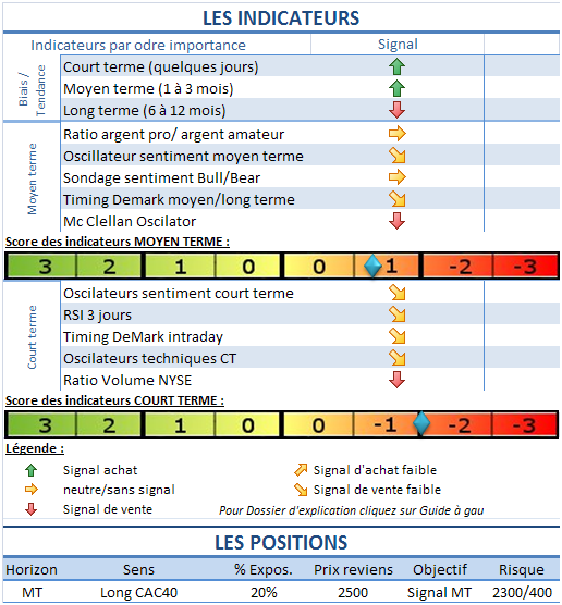Nous avons posté une alerte hier après-midi car le premier objectif à M3 a été atteint sur le S&P500 et le CAC. Nous diminuons donc l'exposition acheteuse moyen terme de moitié (de 40% à 20%). Le solde de la position est conservée jusqu'à ce qu'un signal de vente moyen terme se mette en place (barre d'indicateur du tableau ci-dessus dans la zone -2).