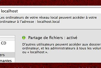 - Sous OS X, allez dans les Préférences systèmes et cliquez sur l'icône Partage. Cochez partage de fichiers. Retenez aussi l'adresse en .local sous le nom de l'ordinateur (ici, localhost.local).