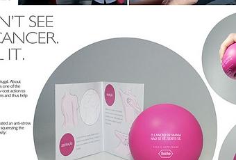 La pub du jour a pour but de rappeler aux femmes portugaises l’importance de faire un dépistage afin de vérifier qu’il n’y a pas de problème de cancer du sein. La solution trouvée était simple : distribuer 50 000 balles anti-stress, mais avec 1 boule en ciment cachée à l’intérieur. Le but était de rappeler qu’un cancer ne se voit pas, et que le seul moyen c’est de faire une palpation mamaire.