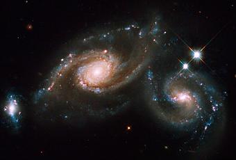 Situés à environ 400 millions d’années-lumière de la Terre, dans la constellation de la Vierge, nous découvrons deux galaxies spirales dont l’une semble être une spirale barrée (à droite). La troisième, visible à gauche, apparait plus petite et peuplée de nombreuses étoiles bleues et jeunes.