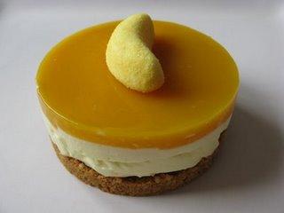 Préparez le nappage. Mettez la feuille de gélatine à tremper dans l’eau froide pendant 10 minutes. Faites chauffer le jus de fruits à feu doux dans une petite casserole. Ajoutez la gélatine amollie et mélangez. Laissez refroidir puis versez le nappage sur la crème dans les cercles à pâtisserie. Laissez au frais toute la nuit. Au moment de servir, démoulez les entremets et servez à l’assiette.