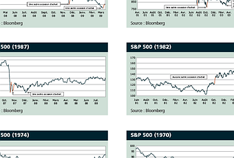 Toutefois, en octobre 1982, le marché a poursuivi sa lancée après s’être redressé pendant quatre jours. Il y a des différences remarquables entre cette situation et les autres. La progression de 10 % en 1982 ne s’est pas produite après que le marché ait atteint un creux comme c’était le cas les huit autres fois ; elle est survenue après que le marché ait déjà enregistré une hausse de 20 % par rapport au creux. À l’exception de la reprise de 1982, le marché s’est toujours replié, au cours des quatre mois qui ont suivi, d’au moins 6,8 % par rapport au niveau de redressement atteint en quatre jours.